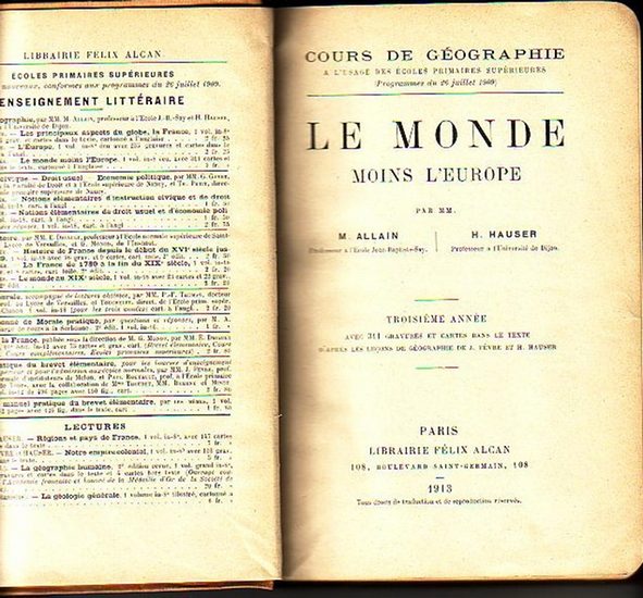 Le Monde moins l'Europe. (= Cours de Géographie). Paris: Librairie Félix Alcan, troisiéme année, 1913. II, 518 pages avec 311 gravures et cartes dans le texte. Toile. K04952.