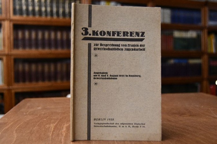 3. Konferenz zur Besprechung von Fragen der gewerkschaftlichen Jugendarbeit. Abgehalten am 6. und 7. August 1925 in Hamburg, Gewerkschaftshaus Berlin, Verlagsgesellschaft des Allgemeinen Deutschen Gewerkschaftsbundes, 1925. 56 S. 20 x 13 cm, Broschur. Einband berieben, bestoßen und angeschmutzt. Schnitt fleckig. Innen sauber.