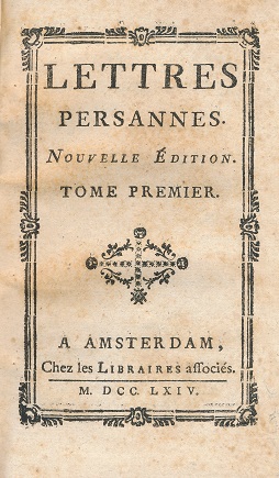 Lettres persannes. Nouvelle édition.2 Bände in 1.Amsterdam, chez, 1764. geglätt.Led.d.Zt.m.reicher Verg.u.marm.Vorsätzen.175; 171 S., jeweils m.Titelleiste, Vignette u.Initiale in Holzschnitt.Seltene Ausgabe dieses satirischen Briefromans zweier fiktiver persischer Europareisenden, dem 1721 erstmals erschienenen Hauptwerk d.Verf.Band gering fleckig, stellenweise leicht gebräunt, sonst schönes Expl.eines d.wichtigsten literarischen Werke der Aufklärung.