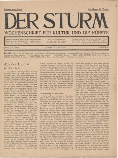 Der Sturm. Wochenschrift für Kultur und die Künste. Jahrgang 1911, Nr. 80, Oktober. Herausgegeben von Herwarth Walden. Berlin, Sturm-Verlag, 1911. S. 635 -642. OHeft., Titel. HdO 53824. - Mit dem Inhalt: TRUST, Aus der Heimat: Der Türke in Berlin. Durchdringung mit Volksgeist. Gemäldeausstellungen. Konzerte. War Goethe musikalisch. Nochmals der Dichter Sabberer. K. H., Spielereien einer Kaiserin. P. Zech, Gedichte. E. Lasker-Schüler, Briefe nach Norwegen. A. Ehrenstein, Passion. K. Hiller, Offener Brief an den Herausgeber. - Einmal gefaltet, papierbedingte Oxidation, leichte Gbrsp., leicht stockfleckig.