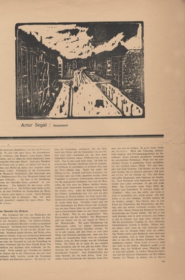 Der Sturm. Wochenschrift für Kultur und die Künste. Jahrgang 1911, Nr. 82, Oktober. Herausgegeben von Herwarth Walden. Berlin, Sturm-Verlag, 1911. S. 651 - 657 + 1. OHeft., Beispiel. HdO 53826. - Mit dem Inhalt: TRUST, Der Sumpf von Berlin. aw, Café Größenwahn. M. Steiner, Schopenhauer und die Politik. J. van Hoddis, Italien. E. Lasker-Schüler, Briefe nach Norwegen. TRUST, Aus Berlin: Juryfrei. Die Orestie im Zirkus. R. Kurtz, Apotheose der Gebrüder Herrnfeld. E. Blass, Wirkungen. Artur Segal, Holzschnitt. - Einmal gefaltet, papierbedingte Oxidation, leicht stockfleckig, starke Läsuren, Lichtschatten. - Nathanson 2.