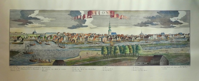 Altona. (Ansicht von der Elbe aus). Handkolorierte Panorama-Ansicht auf Bütten. REPROGRAVÜRE der Ausgabe Augsburg, um 1710. (Wien, Edition Totius Mundi, [ca. 1965]). Bildgröße 29 x 93 cm; Blattgröße 45 x 104 cm. Nach einem von zwei Platten gedruckten Kupferstich von Friedrich Bernhard Werner (1690-1776), bedeutender Schöpfer von Stadtansichten, um 1730 verlegt bei Jeremias Wolff in Augsburg. - Von der Elbe aus gesehen reicht das Panorama vom Morgenwegschen Garten im Westen bis zur St. Pauli-Kirche "aufm Berge", die schon zur Hamburger Vorstadt St. Pauli gehörte. Mit Legende unter der Darstellung. - Mit winzigen Braunfleckchen im äußeren weißen Rand.