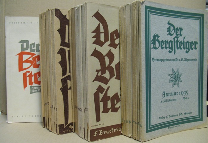 Der Bergsteiger - Deutsche Monatsschrift für Bergsteigen, Wandern und Schilaufen. Konvolut v. 43 Heften der Jahrgänge 5 bis 9 (zwischen Jan. 1935 u. Dez. 1938). München - Wien, Alpenverlag F. Bruckmann KG, 1935-1938. 4°; Konvolut von 43 Heften. Je Heft getrennte Zählung d. Nachrichtenteis u. d. redaktionellen Teils: Seiten 53-274 + 193-768 / 1-264 + 1-712 / 1-268 + 1-763 / 1-16, 64-224 + 1-64, 195-644 / 1-96 + 1-192. mit zahlreichen Abbildungen, Fotos und Karten. Fraktur;. papierbedingt gebräunt, 1 Heft am unteren rand gestaucht/ berieben, teils minimal fleckig 5. Jahrgang (1934/25): Hefte 4-12 (Jan. 1935-Sept. 1935). _ 6. Jahrgang (1935/36): Hefte 1-12 = komplett (Okt. 1935-Sept. 1936). _ 7. Jahrgang (1936/37): Hefte 1-11 (Okt. 1936-Aug. 1937). __ 8. Jahrgang (1937/38): Heft 1, 4-10 (Okt. 1937, Jan-Juli 1938). _ 9. Jahrgang (1938/39): Hefte 1-3 (Okt.-Dez. 1938) __ innnerhalb des Konvolutes fehlen die Hefte Sept. 1937, Nov.+Dez. 1937, Aug.+Sept. 1938.