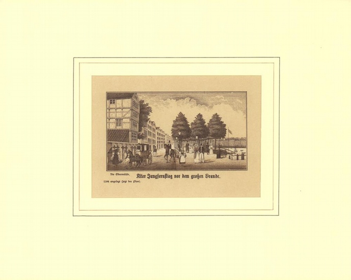Alter Jungfernstieg vor dem großen Brande. Zinkographie. Hamburg, Rudolph Senf, [ca. 1894]. Druck in Schwarz, Braun und Weiß auf sandfarben getöntem Fond. Bildmaß ca. 6,6 x 11,6 cm. Unter Passepartout. Druck und Verlag von Rudolph Senf, Hoflithograph, Hamburg, Rödingsmarkt 12 / Commissionsverlag von G. W. Niemeyer Nachflger. (Inh. G. Wolfhagen). Gedruckte Detailbezeichnung: "Die Obermühle, 1164 angelegt (jetzt der Plan)". Nach der Lithographie "Der alte Jungfernstieg von Belvedere aus, in Hamburg", erschienen bei Peter Suhr 1830 (Orig.-Format ca. 12 x 19 cm). - Selten Variante.