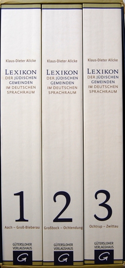 Lexikon der jüdischen Gemeinden im deutschen Sprachraum. Band 1: Aach - Groß-Bieberau. / Band 2: Großbock - Ochtendung. / Band 3: Ochtrup - Zwittau. 3 Bände. Gütersloh, Gütersloher Verlagshaus Gerd Mohn, 2008. Sehr guter Zustand. 3 Broschuren im Schmuckschuber, VIII,4680 Seiten, mit zahlreichen Abbildungen im Text, zweispaltig, 31,2 x 22,4 cm. Guter bis sehr guter Zustand. 1. Aufl.