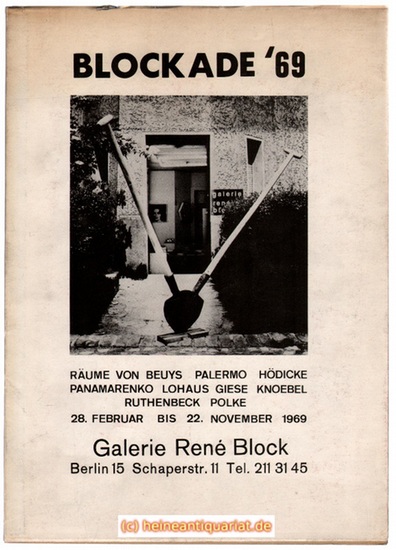 Blockade '69. Räume von Beuys, Palermo, Hödicke, Panamarenko, Lohaus, Giese, Knoebel, Ruthenbeck, Polke. 28. Februar bis 22. November 1969. Berlin, Galerie René Block, 1969. (29 x 20,8 cm); 4°; 51 unpaginierte Blätter mit zahlreichen Abbildungen in Schwarzweiss; Orig.-Broschur mit Leinenrückenstreifen; Orig.-Umschlag. Umschlag am oberen Rand etwas ausgefranst und teilweise nachgedunkelt.