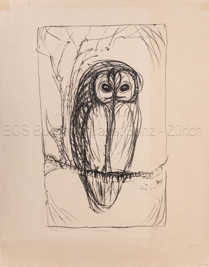 Eule auf einem Ast. ? Waldkauz die Eule. 1952. Kreidelithographie von Hans Fischer. + Wichtig: Für unsere Kunden in der EU erfolgt der Versand alle 14 Tage verzollt ab Deutschland / Postbank-Konto in Deutschland vorhanden +, Abb. Bildausschnitt: 43 x 27 cm. Scheidegger 200. - Unten vom Künstler mit Bleistift signiert, bezeichnet «Waldkauz» und «Probe».