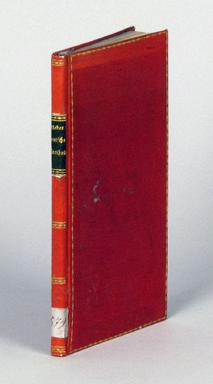Ueber teutsche Freiheit und Vertretung teutscher Völker durch Landstände. Leipzig, Baumgärtner, 1814. (2), 46 SS. Ansprechender roter Pappband der Zeit mit goldgepr. Deckelbordüre, Rückenschildchen und -vergoldung. Dreiseitiger Goldschnitt. Türkisfarbene Buntpapiervorsätze. 8vo. Erste Ausgabe. - "Bestimmt auf den Wiener Congreß einzuwirken und besonders ausgezeichnet durch die glänzende Widerlegung jener falschen Souveränitätslehre, wie sie die Rheinbundsfürsten zum Theil gegen ihre Unterthanen praktisch gemacht, um in der eigenen Tyrannei die eigene Knechtschaft unter dem Fremdherrscher vergessen zu lassen" (ADB). Der deutsche Jurist Paul Ritter von Feuerbach (1775-1833) war der Begründer der modernen deutschen Strafrechtslehre und Schöpfer des bayerischen Strafgesetzbuches von 1813 sowie Obervormund und Gönner von Kaspar Hauser. Er war Vater des Philosophen Ludwig Feuerbach und Großvater des Malers Anselm Feuerbach. - Stellenweise unbedeutend fleckig. Der hübsche Einband am Hinterdeckel gering lichtrandig. Aus der Bibliothek des Herzogs Max in Bayern (1808-88), Vater der Kaiserin Elisabeth von Österreich. - Holzmann/Bohatta VI, 309, 7928. Goedeke VI, 231, 17. ADB VI, 736.