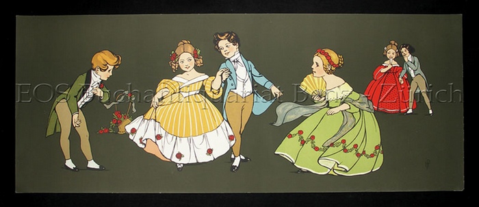 (6 tanzende Kinder). (Leipzig, Hollerbaum & Schmidt), ca. 1910. Farbige Lithographie. 70 x 28 cm. + Wichtig: Für unsere Kunden in der EU erfolgt der Versand alle 14 Tage verzollt ab Deutschland / Postbank-Konto in Deutschland vorhanden +, 492DG. Als Wandbild oder Fries für Kinderzimmer und Schulen gedacht. Ursprünglich wurden diese Wandfriese mit der Darstellung von kindlichen Motiven und Märchen von Gertrud Caspari gemacht und über den Verlag Voigtländer vertrieben. Da dieses Geschäft erfolgreich schien, kopierte der Berliner Plakatverlag Hollerbaum & Schmidt dieses Idee. - Sehr dekoratives Blatt mit den Initialen HP im Stein.