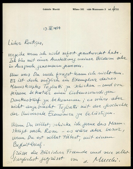 Eigenh. Brief mit U. (?Mucchi?). Wohl Mailand, 13. März 1954. 1 S. Gr.-4to. An den Dramaturgen Willy Roettges betr. eines seiner Manuskripte: ?[...] Um was Du mich fragst kann ich nicht tun. Es ist doch möglich ein Exemplar deines Manuskriptes Togliatti zu schicken ? und von seinem Sekretär einen liebenswürdigen Dankesbrief zu bekommen; es wäre aber nicht angebracht Togliatti mit der Geschichte der Universale Economica zu belästigen [...]?. ? Auf Briefpapier mit gedr. Briefkopf; mit kleinen Randläsuren.