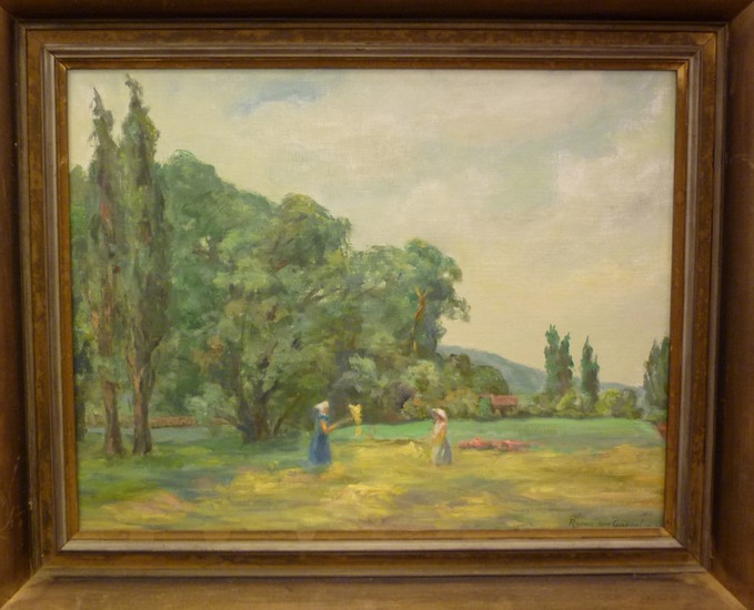 Heuernte. Oel auf Malplatte. _. Bildgrösse: 39x50 cm. Unten rechts signiert. Gerahmt 52x62 cm.