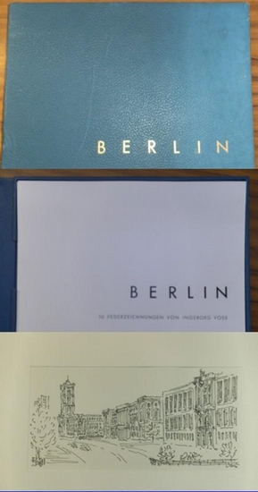 Berlin. 10 Federzeichnungen von Ingeborg Voss: Berliner Dom, Rotes Rathaus, Humboldt- Universität, Sowjetisches Ehrendenkmal, Alte Wache, Fernsehturm, Kino International, Staatsratsgebäude, Staatsoper mit Hedwigkathedrale und ?. Ohne Impressum, Ort und Jahr. Folio-quer (28 x 37 cm). Bläuliche Originallederkassette. Enthaltend 1 Titelkarton und 10 lavierte Original-Federzeichnungen unter Passepartout (25 x 34 cm). Im Druck signiert. Die Kassette mit goldgeprägtem Titel Berlin, der Unterboden mit Samt bezogen, insgesamt etwas berieben. Im Innenerhalt einwandfrei. Unikat, da jede Kassette mit unterschiedlichen Ansichten zusammengestellt wurde. M10601.