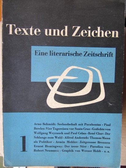 Texte und Zeichen. Eine literarische Zeitschrift. 16 Hefte. Komplett. Luchterhand Verlag, Berlin und Neuwied, 1955 - 1957. 558 + 663 + 663 S. (pro Jahrgang durchgehend nummeriert) zzgl. mehrere Seiten Verlagsanzeigen pro Heft. O-Broschur. Z.T. mit Illustrationen und Fotograhien. Umschlagentwurf von Gisela Andersch. Autoren waren u.a. Adorno, Enzensberger, Fried, Max Frisch, Wolfgang Koeppen, Arno Schmidt, Helmut heissenbüttel, Ludwig Harig, Walter Jens, Paul Celan. Die meisten Beiträge waren Erstdrucke (so u.a. Arno Schmidt Seelandschaft mit Pocahontas. Wegen dieses Textes erfolgte eine Strafanzeige wegen Gotteslästerung und Pornographie gegen den Verlag und den Autor). (5,5) Einige Hefte mit leichten Gebrauchsspuren am Einband. Das Papier ist zeitbedingt gebräunt. Insgesamt jedoch gute Exemplare. Konplett eher selten. Rare. Good copies. Important german literary edition. Complete. <**UTFAQ**>Actually it is not possible, sending books to the USA. Aktuell können keine Bücher in die USA versandt werden.**UTFAQ**>.