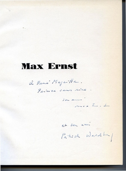 Eigenh. Widmung mit U. in: Patrick Waldberg: Max Ernst. (Paris), Jean-Jacques Pauvert, (1958). 443, (5) SS. 4to. Leinen mit blindgepr. Rücken- und Deckeltitel. "À René Magritte. Prince san rire. / son ami / Max Ernst". Mit einer weiteren Widmung und U. von Patrick Waldberg.