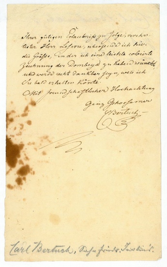 Eigenh. Brief mit U. O. O. u. D. ? S. 8vo. An einen Herrn Lefevre zur Übersendung eines Buches, worin er "eine leichte colorirte Zeichnung der Dombaya" zu haben wünschte. - Am linken Rand stärker fleckig.