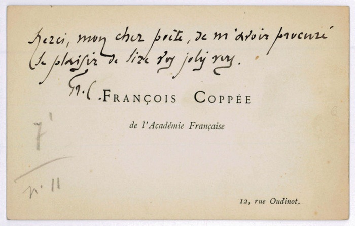 Autograph visiting card signed ("Fr.C."). N. p. o. d. Visting card format (117 x 68 mm). 2 lines. To thank a "dear poet" for his "beautiful verses": "Merci, mon cher poète, de m'avoir procuré le plaisir de lire ses joli vers". - On a printed visting card "François Coppée de l'Académie Française". Some browning. With a collector's note in pencil.