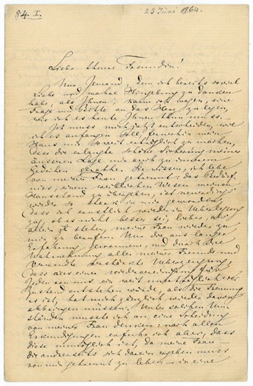 Eigenh. Brief mit U. Starnberg, 25. VI. 1864. 5 SS. auf 3 Bll. Gr.-8vo. Mit eh. adr. Kuvert mit gepr. Absenderemblem und Initialen verso. Bedeutender und umfangreicher Brief an Josephine Maier, die Mutter seiner engen Freundin Mathilde Maier; die vielzitierte Aufforderung Wagners an Mathilde mit ihm zusammenzuleben, pro forma an die Mutter gerichtet: "Liebe theure Freundin! Nur Jemand, dem ich bereits soviel Liebe und wahre Hingebung zu danken habe, als Ihnen, kann ich wagen, eine Frage und Bitte an das Herz zu legen, wie ich es heute Ihnen thun muss. - Ich muss mich jetzt entscheiden, wie ich es anfangen soll, fernerhin mein Haus mir soweit erträglich zu machen, dass die erlangte schöne Sicherung meiner äusseren Lage mir auch zu innerem Gedeihen gerathe. Sie wissen, ich lebe von meiner Frau getrennt: das Bedürfniss, einem weiblichen Wesen meinen Hausstand zu übergeben, ist neuerdings wieder so stark in mir geworden, dass ich ernstlich wieder in Ueberlegung zog, ob es nicht besser sei, lieber, als allein zu stehen, meine Frau wieder zu mir zu berufen. Nur die aus langer Erfahrung gewonnene, und durch die Wahrnehmung aller meiner Freunde und Verwandte verstärkte Ueberzeugung, dass aus einer Wiedervereinigung für Jeden von uns ein weit unerträglicherer Zustand entstehen würde, als die Trennung ist, hat mich gänzlich wieder davon abbringen müssen [...]". - Obwohl an ihre Mutter adressiert, sandte Wagner diesen mehr als bemerkenswerten Brief direkt an Mathilde Maier, die das Schreiben nach Kenntnisnahme des Inhalts jedoch nicht an ihre Mutter weitergab und Wagners Angebot in der Folge ablehnte, ihm aber zeitlebens freundschaftlich verbunden blieb. - Der Brief zuletzt vollständig gedruckt bei M. Dürrer (Hg.), Richard Wagner. Sämtliche Briefe, Bd. 16. Briefe des Jahres 1864, Wiesbaden/Leipzig/Paris 2006, Nr. 204, S. 245ff., Kommentar S. 599 mit Hinweisen zu den früheren Ausgaben.
