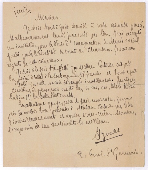 Autograph letter signed. Paris, "Jeudi" [21 March 1895]. 8vo. 1 p. To the lawyer Anatole Catusse, declining an invitation to dinner because of his earlier acceptance of an invitation to attend the "inauguration dinner of the Musée social". The letter can be dated with respect to the dinner that took place on Monday 25 March 1895. As Izoulet mentions, the Musée Social was funded by count Aldebert de Chambrun. - In the second part of the letter, Izoulet expresses his regret that Madame Marie-Maguerite Catusse couldn't attend a Latin thesis defense ceremony at the Sorbonne earlier that year because the "hall was full" when she arrived. - Marie-Maguerite Catusse (1858-1928) was one of the closest friends of Marcel Proust's mother Jeanne Weil and a friend and longtime correspondent of Marcel Proust. - The Musée social was founded to preserve documents from the Social Economy pavilion of the 1899 Exposition Universelle. Over the years, the well-funded institution became an important center of research into a broad range of topics, including social housing, labor organization, and city planning. Based on its expertise and important supporters and members, the Musée social gained great influence over government policy in the 1st half of the 20th century. - With a tear to a fold slightly affecting the text.