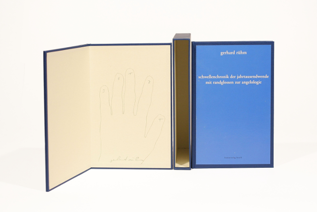 schwellenchronik der jahrtausendwende mit randglossen zur angelologie. (Graz-Wien), Literaturverlag Droschl, (2001). Gr.-8°. Mit zahlr. Notenbeispielen. 107 S., OPpbd. m. mont. OUmschlag bzw. OPpbd. (Diptychon), zus. in OPp.-Schuber. Erstausgabe. - Vom Verfasser im Druckvermerk eigenh. signiert. - Eines von 10 Exemplaren der Vorzugsausgabe mit einem Diptychon mit einer eigenh. signierten Bleistiftzeichnung des Verfassers.