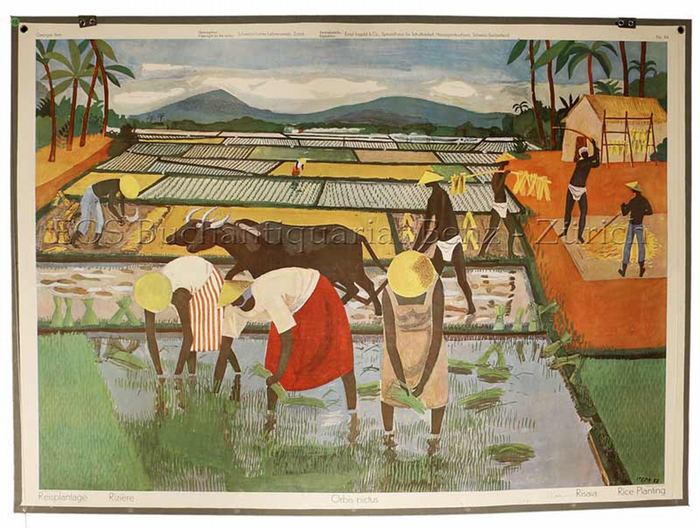 Reisplantage - Rizère - Orbis pictus - Risaia - Rice planting. Herzogenbuchsee, Ernst Ingold, 1954. Farbiger Offsetdruck auf Papier auf Leinen aufgezogen. Bildgrösse: 66 x 90 cm. + Wichtig: Für unsere Kunden in der EU erfolgt der Versand alle 14 Tage verzollt ab Deutschland / Postbank-Konto in Deutschland vorhanden +, bild. Schw. Schulwandbild Nr. 84.