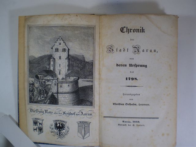 Chronik der Stadt Aarau, von deren Ursprung bis 1798 Aarau, S. Landolt, 1840, Auflage: 1. kartoniert; späterer (um 1900), fester, marmorierter, unbedruckter Einband / Anz. Seiten: 224 / 13 x 21 cm / mit 1 Lithografie als Frontispiz (Die Burg Roxe oder der Freyhof von Aarau) / Zustand: gut, leichte Gebrauchsspuren; Aussengelenke leicht angeplatzt, Papier leicht stockfleckig, erste 4 Blätter im oberen Bereich wasserfleckig, Besitzereintrag verso Frontispiz.