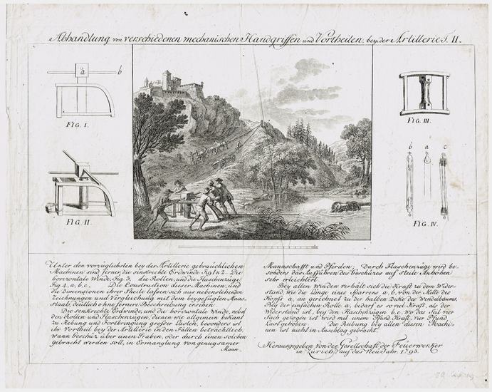 Neujahrsblatt der Feuerwerker-Gesellschaft 1793. Abhandlung von verschiedenen mechanischen Handgriffen und Vortheilen bey der Artillerie T. II. Kupferstich von J.R. Schellenberg. Zürich, 1793. Blattgrösse: 30x36,8 cm. Plattengrösse: 26,5x35,7 cm. 1 x gefaltet. - Mit 2 kleinen Randeinrissen.