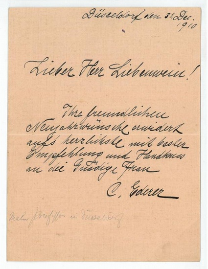 Eigenh. Brief mit U. Düsseldorf, 31. XII. 1910. 1 S. auf gefalt. Doppelblatt. 8vo. Erwidert die Neujahrswünsche des Malers Maximilian Liebenwein (1869-1926). - Ederer studierte in Wien an der Kunstgewerbeschule und der Akademie der bildenden Künste, erhielt 1900 den Rompreis und verbrachte ein Jahr in Italien und Tunis. 1911 wurde er als Prof. für dekorative Malerei und angewandte Kunst an die Düsseldorfer Kunstakademie berufen. Er malte vorwiegend Landschafts- und Tierbilder; daneben beschäftigte er sich auch mit religiöser Kunst in Form von Mosaiken und Glasmalereien. E. schuf Mosaiken für die Kirche Am Steinhof in Wien und für die Lukaskirche in Berlin-Steglitz. Auf der Großen Kunstausstellung 1911 in Düsseldorf wurden mehr als vierzig seiner Pastelle, Aquarelle, Tempera- und Ölbilder, Zeichnungen und Litographien gezeigt.