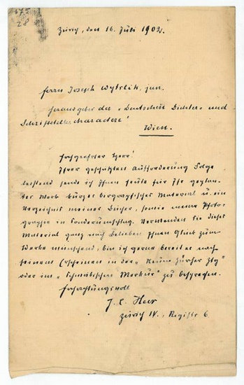 Eigenh. Brief mit U. Zürich, 16. VII. 1902. 1 S. auf Doppelblatt. 8vo. An Joseph Wytrlik, den Herausgeber der "Deutschen Dichter- und Schriftstellercharactere": "Ihrer geschätzten Aufforderung Folge leistend sende ich Ihnen heute für Ihr geplantes Werk kurzes biografisches Material u. ein Verzeichnis meiner Bücher, sowie meine Photographie in Sonderumschlag. Verwenden Sie dieses Material ganz nach Belieben [?]". - Heer war als Berichterstatter der "Neuen Zürcher Zeitung" tätig, deren Feuilletonredakteur er 1892 wurde. 1898 erschien sein Roman "An heiligen Wassern", der ihn schlagartig berühmt machte und später mehrfach verfilmt wurde. Mit seinem zweiten Hochgebirgsroman "Der König der Bernina" (1900, ebenfalls verfilmt) vermochte Heer diesen Erfolg noch zu steigern und wurde zum meistgelesenen Vertreter des Schweizer Heimatromans.