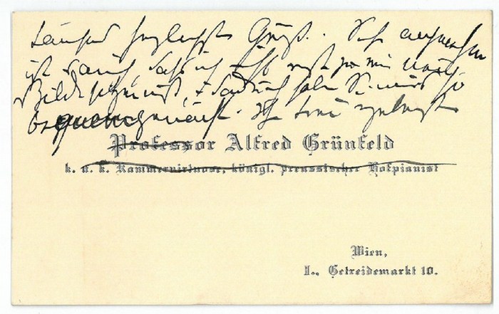 Eigenh. Brief auf Visitkarte. Wien, 5. II. 1917. 2 SS. 115 x 70 mm. An einen namentlich nicht genannten Adressaten: " Ich las ja in der Zeitung von der mir zugesandten großen Ehrung d. Stadt Wien die mir viel Freude macht [?]". - Alfred Grünfeld studierte an den Konservatorien in Prag und Berlin und kehrte dann nach Wien zurück. Er wurde als Interpret der Werke Mozarts, Schuberts, Schumanns und Brahms sowie durch seine Konzertparaphrasen der Walzer Johann Strauß? bekannt, der ihm den Frühlingsstimmen-Walzer widmete.