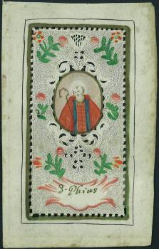 [Spitzenbildchen] - S. Phius [Pius]. o.O., -, o. J. [um 1800?]. Orig. Gouache-Aquarellzeichnung. ca. 15,6 x 9,5 cm [Blatt]., Abbildung. Altkoloriertes und goldgehöhtes Spitzenbildchen des späten 18. bzw. frühen 19. Jahrhunderts. - Stockfleckig, Klebereste a. Rückseite.