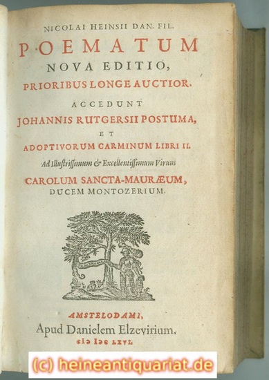 NICOLAI HEINSII DAN. FIL. POEMATUM NOVA EDITIO, PRIORIBUS LONGE AUCTIOR. ACCEDUNT JOHANNIS RUTGERSII POSTUMA, ET ADOPTIVORUM CARMINUM LIBRTI II. Ad Illustrissimum & Excellentissimum Virum CAROLUM SANCTA-MAURAEUM, DUCEM MONTOZERIUM. [Druckermarke "Minerva", Rahir "M. 17"]. AMSTELODAMI, Apud Danielem Elzevirium, MDCLXVI (1666). [Folgende Titelbestandteile in Rot gedruckt: "POEMATUM", "PRIORIBUS LONGE AUCTIOR.", "JOHANNIS RUTGERSII POSTUMA,", "ADOPTIVORUM CARMINUM LIBRTI II.", "CAROLUM SANCTA-MAURAEUM,", "AMSTELODAMI," und "MDCLXVI."] 1 (weißes) Blatt, 4 Blätter (incl. typographischer Titel in rot und schwarz); 352 Seiten, 150 Seiten, 1 Blatt ("Emendanda & mutanda"); 1 (weißes) Blatt. Mit fünf Pergamentstreifen gehefteter Pergamentband der Zeit mit späterem, handschriftlichem Rückentitel, sowie allseitigem rotem Sprenkelschnitt.