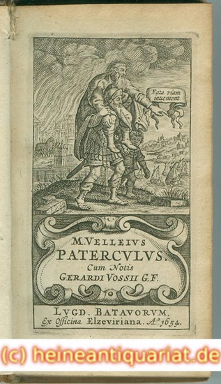M. VELLEIVS PATERCVLVS. [Historiae Romanae.] Cum Notis GERARDI VOSSII G. F. LVGD. BATAVORVM (Leiden), Ex Officina Elzeviriana [Jean und Daniel Elzevir]. A° 1654. 6 Blätter (incl. gestochenem Titel), 116 Seiten, 14 Blätter (Index), 1 Blatt [Zwischentitel (nicht nummerierte Seite 1): "GERARDI VOSSII G. F. NOTae IN M. VELLEIVM PATERCVLVM."], Seite 3 - 128, 1 Blatt (recto: "ADDENDA.", verso: "ERRATVM."), 1 (weißes) Blatt. Späterer Lederband. (13,4 x 7,7 cm, bzw. 12,9 x 7 cm; Buchblock: 1,4 cm) 12°. Bérard 74 f. Pieters 216 auf S. 127. Willems 752 ("Réimpression ligne pour ligne, mais moins soignée. de l'édition de 1639 (no 484). Chose singulière, on a poussé la fidélité jusqu'à reproduire les addenda à la fin du volume ainsi que la faute d'impression signalée dans l'erratum."). Minzloff S. 213 f. Goldsmid III, 14. Rahir 757. Berghman 2108. Copinger 3524. Broman 213 [gibt irrtümlich 1655 als Erscheinungsjahr an]. Roggebibliotekets S. 29. Willems (Catalogue) 517 ("Exemplaire C. Pieters."). Karl & Faber 30, 386. Drouot (1946) 167. Lengertz 555. Thulins 148, 517. Kraus 198. Vergl. Phiebig 147 [Bestandteil eines Konvolutes, wahrscheinlich EHC 12.1654.Pat.01 ("... another edition, later red morocco, g. e., spine slightly faded ....")]. EHC 12.1654.Pat.00 + 01 [?=aus Phiebig 147 ?]. Weddigen 093. Vergl. Ebert 23475 ("1639, 12. Wiederholt * ib., id., 1654 od 64, 12. Von krit. Werth."). Schweiger 1127. Geglätteter, englischer Kalblederband des 18. Jahrhunderts über vier Bünden, mit goldgeprägter Doppelfilete auf den Deckeln und ehemals reicher, nun stark verblasster Rückenvergoldung. Berieben, bestoßen, besonders die Ecken, Fehlstelle am oberen Kapital. Die Innendeckelbezüge und die fliegenden Vorsätze mit Leimschatten, innen durchgehend wenig gebräunt. Dieses Exemplar nun wieder mit der kürzeren Vorwortvariante mit dem auf den 30. April 1639 ("Pridie Kal.[endas] Majas") datierten ursprünglichen Vorwort. Neben dem gestochenen Titel mit einigen Schmuckinitialen und den folgenden fleurons verziert: auf Blatt 2 und 3 jeweils recto ein Büffelkopf (Rahir 16), auf Seite 1 die Sirene vom Typ Rahir 22, auf Seite 3 der Anmerkungen im zweiten Teil findet erneut der Büffelkopf (Rahir 16) Verwendung. Provenienz: Keppel, Weddigen Auf dem vorderen Innendeckel das Wappenexlibris mit dem Motto "NE CEDE MALIS" des "Frederick Keppel", darunter die handschriftlichen bibliographischen Vermerke Weddigens. Es handelt sich hier wohl um den Frederick Keppel, der der Sohn des gleichnamigen früheren Bischofs von Exeter war und von 1762 bis 1830 in Lexham Hall, Norfolk, lebte. * Bitte fordern Sie bei Interesse unsere umfangreichen Anmerkungen an. *.