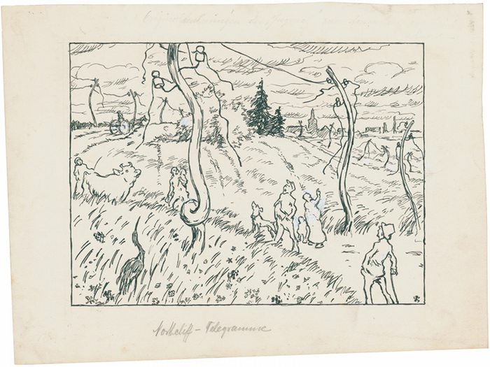 Northcliff-Telegramme. Zerstörte Telegraphenleitung, von Landvolk bestaunt. _. Tuschfederzeichnung, Deckweiß. Mit dem Zeichen des Künstlers. 25,1:34,3 cm. Literatur: Dreitausend Kunstblätter der Münchner ?Jugend?. Ausgewählt aus den Jahrgängen 1896-1909, hrsg. v. G. Hirth, neue vermehrte Ausgabe, München, 1909, SS. XII, 314-319; Goldstein, SS. 672, 822; Flemig, S. 251. Karikaturist, Illustrator, Journalist, Mitarbeiter ?Jugend?, ?Der Scherer? in Innsbruck und ?Münchener Bilderbogen?.