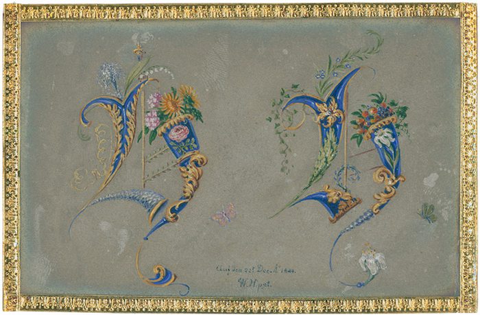 Reich verzierte Initialen H. H. _. Deckfarbenmalerei und Goldbronze, auf grauem Papier und mit Goldlitze umrandet, unten mittig datiert und monogrammiert ?auf den 22t. Dec. Ao 1844 W. H. pxt.? 6,3:10 cm. Vermutlich ist diese sehr reizvolle, mit hoher buchmalerischer Finesse ausgeführte ?Miniatur? aus einem familiären Anlaß entstanden. Anknüpfend an die Tradition der Buchilluminatoren im Stift von St. Gallen widmete sich Hartmann nach einer Ausbildung in der Gouachemalerei bei F. Hegi (1774-1850) in Zürich und in der Naturalien- und Wappenmalerei bei E. Wyß (1782-1837) in Bern vor allen Dingen der minutiösen Darstellung von Konchylien, kleinen Vögeln, Käfern, Schmetterlingen etc. Daneben befasste er sich aber auch mit der Wappenmalerei. 1844 veröffentlichte er ein naturwissentschaftliches Werk mit handkolorierten Lithographien über Erd- und Süßwasser- Gasteropoden.