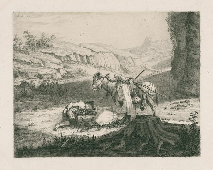 Italienische Landschaft. Junge Frau mit Esel und Treiber. _. Radierung, 1816, auf dünnem Bütten. 14,4:18,7 cm. Literatur: Stoll 211, II (von II) mit der Nummer 15 rechts oben. - Sehr guter Abdruck mit ungewöhnlich breitem Rand. Mit sorgfältiger Restaurierung der linken oberen E cke. Der vor allem als Radierer tätige Grimm war 1804-1808 Schüler der Kasseler Kunstakademie bei Gottlieb Kobold (1769-1809), Andreas Range (1762-1828) und Ernst Friedrich Ferdinand Robert (1763-1843). Durch seine Brüder Jacob und Wilhelm Grimm wurde er mit Clemens Brentano (1778-1842) und Achim von Arnim (1781-1831) bekannt, mit denen er zusammenarbeitete. Wohl 1807 lernte Grimm Bettine Brentano (1785-1859) kennen, von der er zahlreiche Porträts anfertigte. In November 1808 zog er nach Landshut zu Brentano und dessen Schwager Friedrich Carl von Savigny (1779-1861). Auf ihre Vermittlung ging er nach München und erlernte Kupferstechen bei Carl Ernst Christoph Heß (1755-1828). Zugleich studierte er an der Münchner Akademie unter Andreas Seidl (1760-1834). Unterbrechung des Studiums 1814 durch Teilnahme an den Freiheitskriegen. Mit Georg Brentano reiste er im Frühjahr 1816 nach Italien, wo er zwei Monate blieb. 1817 kehrte er nach Kassel zurück. 1824 reiste Grimm zum ersten Mal nach Willingshausen und wurde zum Mitbegründer der Willingshäuser Malerkolonie, eine der ersten Malerkolonien Deutschlands. 1832 wurde er an die Kasseler Kunstakademie als Lehrer berufen.