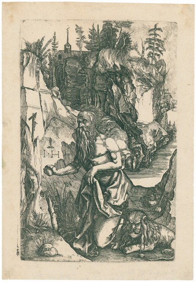 Hl. Hieronymus in der Wüste. um 1497. Eisenradierung, nach A. Dürers Kupferstich um 1497, auf Bütten. 23,1:15,1 cm. Papier in den oberen Ecken, außerhalb der Darstellung, etwas dünn. Literatur: Bartsch 19; Hollstein 22, I (von II) mit dem Monogramm in der Platte; vgl. Meder (Dürer) 57. Vorzüglicher Abdruck mit allseitigem ca. 1,5 cm breitem Rand.