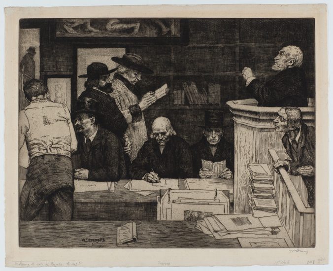 A Sale of Prints. _. Radierung 1889, signiert. 30,3:39,1 cm. Vorzüglicher, gratiger Abdruck in Dunkelbraun. Von älterer Hand als 1st State bezeichnet. Mit leichtem Plattenton gedruckit, vollrandig, auf chamoisfarbenem Bütten mit Wasserzeichen: QWP&AGL. Das seltene und thematisch reizvolle Blatt liegt in bester Erhaltung vor. Literatur: Binyion 143, I. Strang, ausgebildet bei A. Legros (1837-1911) an der Slade School of Fine Art des University College London, übte die verschiedensten Techniken der Druckgraphik aus, wobei er gerade als Porträtist große Beliebtheit erlangte.