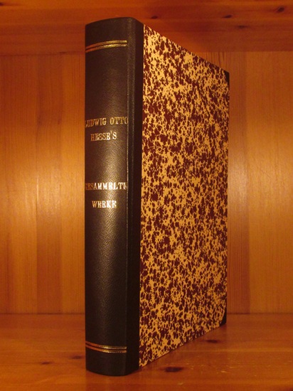Ludwig Otto Hesse's gesammelte Werke. Herausgegeben von der mathematisch-physikalischen Classe der Königlich Bayerischen Akademie der Wissenschaften. München, Verlag der k. Akademie, 1897. VIII, 732 S. (Neuer) Brauner Halblederband mit goldgeprägtem Rückentitel im Großformat 30 x 23 cm, Buchdeckel mit braun-weißen Marmorbezügen und Lederecken. Sehr seltene Werkausgabe des Königsberger Mathematikers Ludwig Otto Hesse (1811 - 1874). Hesse lehrte von 1840 an zunächst als Privatdozent, dann als außerordentlicher Professor an der Königsberger Albertina, spätere berufliche Stationen als ordentlicher Professor waren die Universitäten Halle und Heidelberg sowie schließlich die neu gegründete Polytechnische Schule München. Wissenschaftlich trat Hesse im Besonderen auf dem Gebiet der analytischen Geometrie hervor. Die "Hesse-Matrix" sowie die "Hessesche Normalform", eine spezielle Form der Geradengleichung, sind nach ihm benannt. Die Werkausgabe enthält 44 Abhandlungen Hesses, weitere 5 Abhandlungen aus dem Nachlaß sowie im Anhang einen Lebenslauf und ein Schriftenverzeichnis Hesses sowie weitere Nachlaß-Manuskripte. Mit ganzseitigem Porträt Hesses Heliogravüre als Frontispiz. Der hochwertige Handeinband in neuwertigem Zustand. Tadelloses Exemplar dieser wissenschaftsgeschichtlich bedeutenden, heute im Original kaum noch anzutreffenden Werkausgabe. Weitere Fotos auf der Homepage des Antiquariats (bitte Art.-Nr. auf der Angebotsseite in das Suchfeld eingeben).