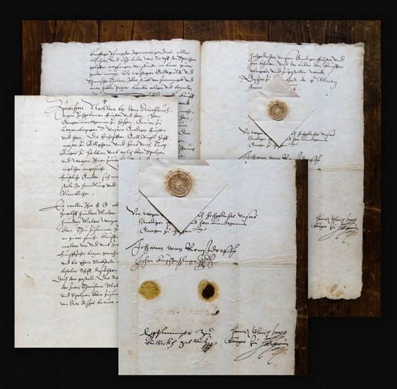 Manuskript auf Papier, Vertrag zwischen Georg I. von Hessen-Darmstadt und dem Bürger von Heilbronn Hanns Ulrich Trapp. Darmstadt, 4. März, 1584. circa 32,5 x 20,8 cm., 1 Doppelblatt. gefaltet, mit papiergedecktem Siegel und Resten von Wachssiegel Umfangreicher Vertrag im Namen des Landgrafen von Hessen-Darmstadt Georg I. (1547-1596), von diesem zwar nicht signiert, aber mit seinen Siegeln. Unterschrieben haben für den Landgrafen die Beamten Johann von Ronssdorff und Johann Kupfferschlager. Aussen kalligraphsicher Vermerk: "Contract fuer den Weytzen Spelzen und kornkauff Hans Ulrich Trappen von Halbron und Gall ... betreffende...". - Autograph, Handschrift, Manuskript. - Wenig gebräunt, leicht fleckig, sonst gut erhalten. - Aus einer bedeutenden Tegernseer Autographensammlung, in eigenhändig beschrifteter Sammlermappe mit kurzen Angaben zum Inhalt und Kaufvermerk: am 26. IV. 1926 bei dem Antiquar Baer in Frankfurt für 3 Mark.