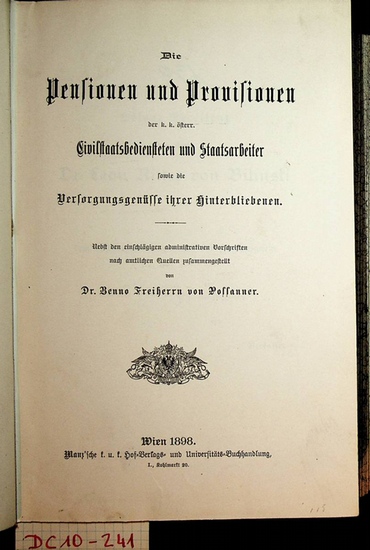 Die Pensionen und Provisionen der k.k. ?sterr. Civilstaatsbediensteten und Staatsarbeiter sowie die Versorgungsgen?sse ihrer Hinterbliebenen : nebst den einschlie?lichen administrativen Vorschriften nach amtlichen Quellen zusammengestellt Wien, Manz Verlag, 1898. original Halblederband, gr.-8?, XLIV, 966 Seiten; Exemplar gestempelt, Einband mit Signaturetikett, Zustand: gut.