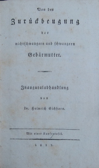 Von der Zurückbeugung der nichtschwangeren und schwangeren Gebärmutter. Inauguralabhandlung. Ohne Ort und Verlag (Nürnberg), 1822. Ca. 20,3 x 12,5 cm. 55 Seiten, mit 1 gefalteten Kupfertafel. Gelber Pappband der Zeit. Dissertation des Nürnbergers Heinrich Eichhorn (1800-1860), der in Würzburg und Erlangen studierte. Er begründete 1840 das 'Medicin. Correspondenzblatt bayerischer Aerzte'. Einband gering berieben. Schönes Exemplar.