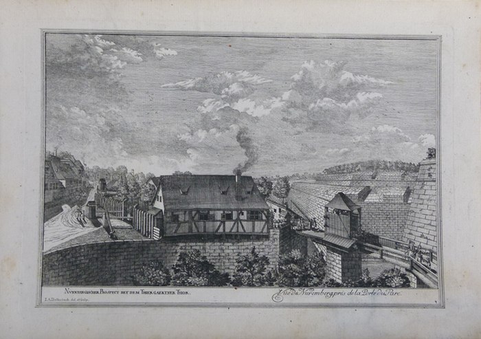 Nürnbergischer Prospect bey dem Thiergartner Thor. Original-Kupferstich von Johann Adam Delsenbach, ohne Jahr (ca., 1750). Ca. 20,5 x 30 cm (Darstellung), ca. 26 x 36 cm (Blattformat). Mit deutscher und französischer Bezeichnung. Zur Verstärkung auf Papier aufgezogen.