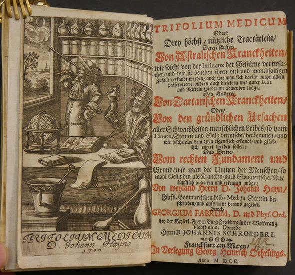 Trifolium medicum Oder: Drey höchstnützliche Tractätlein, Deren Erstes Von Astralischen Kranckheiten, wie solche von der Influenz der Gestirne verursachet ... Das Andere, von Tartarischen Kranckheiten, Oder Von den gründlichen Ursachen aller Schwachheiten menschlichen Leibes ... Das Dritte, Vom rechten Fundament und Grund, wie man die Urinen der Menschen ... künstlich judiciren und erkennen möge: Von weyland Herrn D. Johann Hayne ... beschrieben und aufs neue heraus gegeben durch Georgium Fabrum ... Nebst einer Vorrede Herrn D. Johannis Schroederi. Frankfurt, Georg Heinrich Oehrling, 1700. Ca. 16,5 x 10 cm. Gestochenes Frontispiz, 15 Blätter, 348 (recte 342) Seiten, 18 Blätter, mit 14 kleinen Textkupfern und 5 gefalteten Tabellen. Pergamentband der Zeit mit spanischen Kanten und Farbschnitt. VD17 14:694246Z. Paracelsisch-medizinischer Traktat des Stettiner Leibmedicus Johann Hayne, herausgegeben von dem Friedberger Arzt Georg Faber. Die Textkupfer und die Tabellen zur Urinschau. Paginierfehler nach S. 196, Zählung springt auf S. 203. Namens-Initialen auf Titelblatt, Vorwort seitlich knapp beschnitten (seitliche Anmerkungen mit Buchstabenverlust), teils etwas gebräunt. Schönes Exemplar.