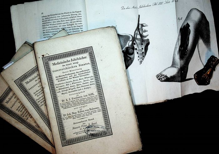 Medicinische Jahrb?cher des kaiserl(ich) k?nigl(ichen) ?sterreichischen Staates. Unter Mitwirkung der Herren Professoren des medicinisch-chirurgischen und des thier?rztlichen Studiums an der Wiener Universit?t: Freyherrn v(on) Jacquin, Bernt, Horn, Wawruch, HerrmannEdl(en) v(on) Wattmann, Berres, Edl(en) v(on) Hildenbrand, Rosas, Klein, Fischer, Czermak, Schroff, Wisgrill, dann Directors Eckel, Hayne, Buchm?ller und v(on) Erdelyi. Neunzehnter (19.) Band oder Neueste Folge 10. (Neunter) Band, 1.-4. St?ck. Mit sechs Steindrucktafeln. KOMPLETT. Wien, Verlag und Druck Carl Gerold, 1836. original Broschuren, gr.-8?, VIII, 732 Seiten und sechs Steindrucktafeln; Zustand: Hefte etwas berieben und staubig, ehemalige Bibliotheksexemplare daher mit Stempeln, altersgem?? in gutem Zustand. Beitr?ge zu: Studium der Heilkunde, ?ffentliches Sanit?tswesen, Herrschende Krankheits-Constitutionen, Beobachtungen und Abhandlungen aus dem Gebiethe der Natur- und Heilkunde, Literatur und mit Miscellen/ Ersch.-verlauf: 1.1812 - 6.1820/21; N.F. 1.1822 - 3.1826; [3.F.] 1=10.1829 - 40/41=49/50.1844; 1.1845 - 66.1848; damit Ersch. eingest.