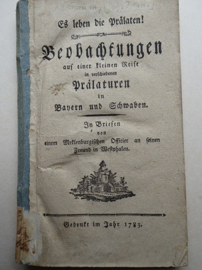 Es leben die Prälaten ! Beobachtungen auf einer kleinen Reise in verschiedenen Prälaturen in Bayern und Schwaben. In Briefen Von Einem Meklenburgischen Officier an Seinen Freund in Westphalen. (Ohne Ort und Verlag). Gedruckt im Jahr 1783. (10), 98, (1) Seiten. Mit einer Titelvignette. Einfache Titelbroschur ohne Umschlag. (Teils mit geringeren Gebrauchsspuren u. einigen Bleistiftunterstreichungen). 17x11 cm. * Sehr selten. Johann Ferdinand Gaum, geboren am 15. 10. 1738 Herrenberg, gestorben am 16.11.1814 in Calw. Repetent in Tübingen 1766-1768. Vikar an der Stiftskirche in Stuttgart 1768, Diakon in Markgröningen 1770. 2. Professor in Blaubeuren 1777, 1. Professor 1785. Dekan in Calw 1797-1814.