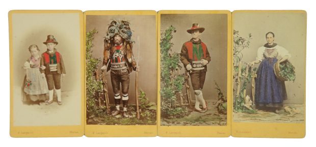 Konvolut von 4 kolor. Orig.-Fotografien mit Trachten. Meran, F. Largajoli, o. J. (um 1870). Kolor. Orig.-Fotografien auf Untersatzkarton im ?Carte de visite-Format? (ca. 10,5 x 6,5 cm). Tlw. schwach fleckig.