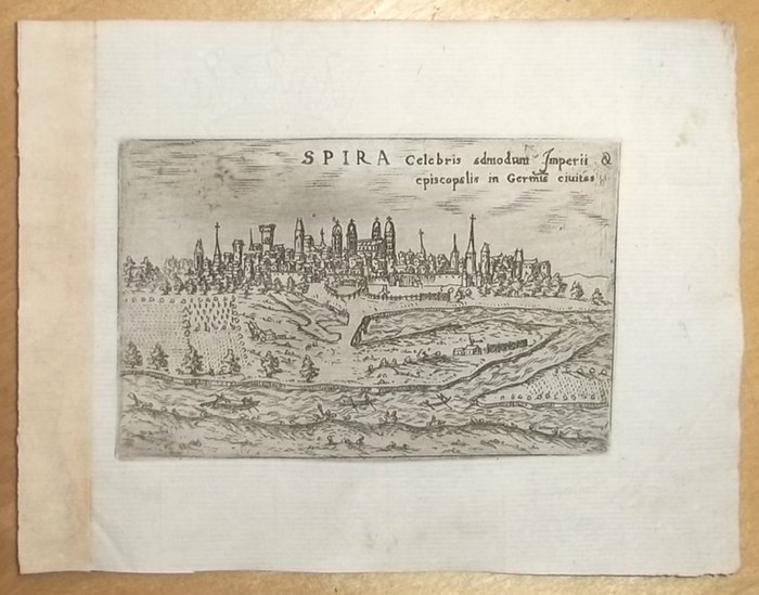 "Spira. Celebris admodum Imperii & episcopalis in Germis ciuitas". Kupferstich von Francesco Valegio. Aus: Raccolta di le piv illustri et famose citta di tutto il mondo. Venedig, Valegio, um 1600. Ca. 8,5 cm x 13 cm. Schöne Gesamtansicht von Speyer über den Rhein. - Fauser 13199. - Blatt im weißen Rand gering braunfleckig.