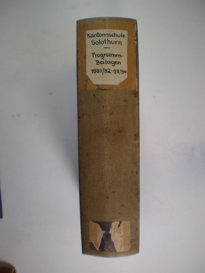 Kantonsschule Solothurn: Programm-Beilagen Solothurn, diverse, 1882-1894. Halbleinen; fester, unbedruckter Einband der Zeit, marmoriertes Überzugspapier, handbeschriftetes Rückenschild / Anz. Seiten: 35, 54, 39, 99, 80, 178, 80, 95 / 15,3 x 21,2 x 4,7 cm / mit 3 Plänen, und 2 Sprachtafeln / Zustand: gut, leichte Gebrauchsspuren; Rücken stockfleckig, ein weiteres Rückenschild abgeblättert, Bibliotheksstempel auf Titelblättern, Besitzereinträge auf Innendeckel und Vorsatz. Die Sammlung beinhaltet folgende Einzelabhandlungen: Feier zur Einweihung des neuen Kantonsschulgebäudes; Sammlung der Gesetze, Verordnungen und Reglemente für die solothurnische Kantonsschule; Festschrift zur Eröffnung des neuen Kantonsschulgebäudes in Solothurn (1882; Inhalt: Walther von Arx: Abschied vom alten Kollegium; Dr. Fr. Lang: Das neue Kantonsschulgebäude; Dr. J. Kaufmann: Über die wichtigsten Resultate der Sprachwissenschaft); Walther von Arx: Der Deutsche Unterricht in unsern Bezirksschulen (1884); M. Gisi: Verzeichniss der Incunabeln der Kantons-Bibliothek Solothurn (1886-87); Sammlung der Gesetze, Verordnungen und Reglemente für die solothurnische Kantonsschule (1894); Dr. J. Kaufmann-Hartenstein: Zur Lehrerbildungsfrage.(1889).