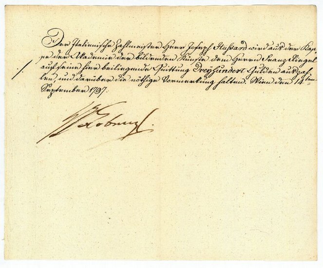 5 Schriftstücke mit eigenh. U. Wien, 1796 und 1797. Je 1 S. Qu.-8vo. An den italienischen Zahlmeister Joseph Hussard, der angewiesen wird, diesen und jenen Betrag an die Herren Valentin Jantscha, Füger, Karl Conti, Franz Riegel und Miliotti auszufolgen. - Der Vetter von Außenminister Johann Ludwig Gf. Cobenzl war seit der Frankreichreise Josephs II. dessen Berater und wurde mit dem Amt des Staatsvizekanzlers betraut. Während der Herrschaft Leopolds II. an Einfluß einbüßend, wurde er von Franz II. zum Hof- und Staatskanzler sowie Außenminister berufen. Als Österreich sich unter seiner Leitung 1793 in den Verhandlungen um die zweite polnische Teilung von Preußen diplomatisch überspielen ließ, hatte dies seine Entlassung zur Folge. 1801 wurde er als Gesandter nach Paris entsandt, nach dem Scheitern seiner Mission 1805 jedoch endgültig entlassen.