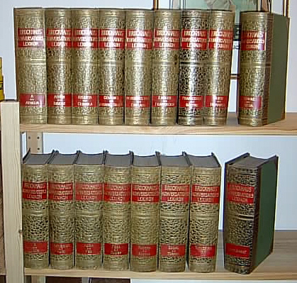 Brockhaus' Konversations-Lexikon. 17 Bände (16 Bände + Supplementband). 14. vollständig neubearbeitete Auflage. Neue Revidierte Jubiläums-Ausgabe. Leipzig, Brockhaus 1908-1910. je Band ca. 1000 S. mit zahlreichen Textabbildungen, teils farbigen Karten und teils farbigen Tafeln [nicht eingehend kollationiert]. Gr.-8°. Original-Halbledereinbände mit goldgeprägtem Rückentitel und Ornamentik, Kopfgoldschnitte, Rücken verblaßt / verfärbt, Einbände teils etwas berieben und bestoßen, wenige Innengelenke etwas angelockert, ExLibris auf vorderen Innendeckeln, einige Trennblätter der Chromotafeln liegen lose bei, einige Trennblätter fehlen, insgesamt gut erhalten.